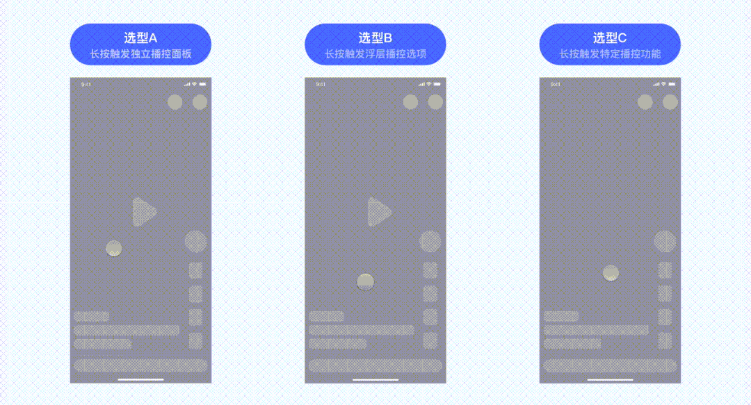 通过对竞品进行调研,我们发现竞品均有使用长按手势作为切入口以触发相关播控功能、并归纳出“视频播控触发”目前主流的三种长按交互选型, 分别为:长按触发独立播控面板、长按触发浮层播控选项、长按触发特定播控功能。