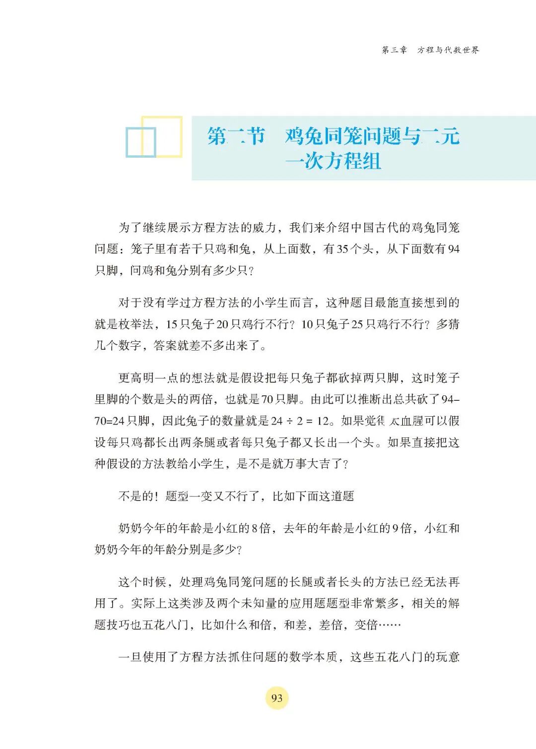 如:在讲到鸡兔同笼问题时,如果是小学生来解题,会被传授假设的解题方法。而事实上,题型一变,假设半天都解不出来。
