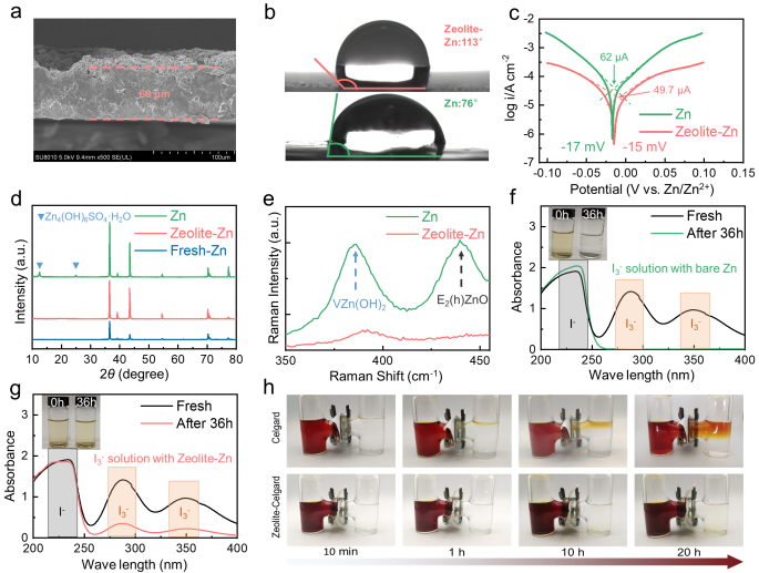图1. (a-e)沸石保护层的形貌、接触角及其对Zn负极腐蚀的缓解作用;(f-h)沸石保护层对I₃⁻的阻隔能力测试。