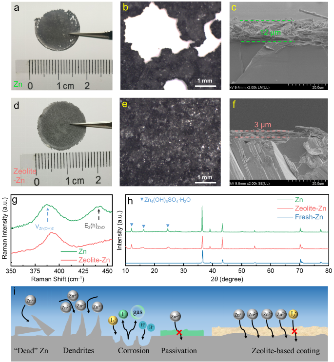图3. 对称电池中循环后的Zn和Zeolite-Zn电极表征:(a, d)光学照片、(b, e)光学显微图、(c, f)SEM图像、(g)拉曼光谱和(h)XRD谱图;(i)沸石基保护层的抑制锌碘电池副反应机理示意图。
