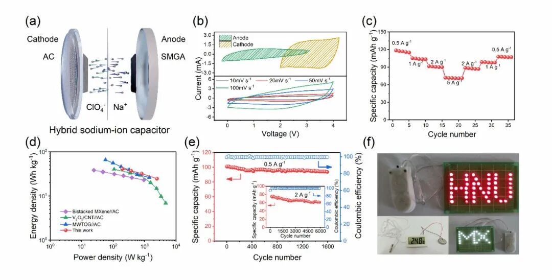 图6. (a) AC//SMGA混合钠离子电容器(SIC)的示意图。(b) 扫描速率为10 mV s⁻¹的钠离子半电池中的SMGA和AC的CV曲线(顶部)和不同扫描速率下的AC//SMGA SIC(底部)。(c) AC//SMGA SIC在0.5至5 A g⁻¹范围内的倍率性能。(d) AC//SMGA SIC与之前报道的SIC相比的Ragone图。(e) AC//SMGA SIC在电流密度为0.5 A g⁻¹和2 A g⁻¹下的长期循环性能和库仑效率(插图)。(f) 由AC//SMGA SIC供电的LED阵列和电子温度计的照片。