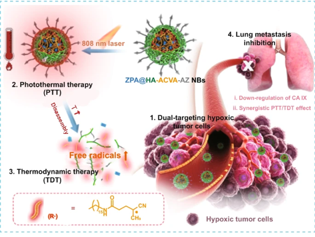 2. 通过在“纳米子弹”表面引入靶向CD44受体的透明质酸(HA)和靶向缺氧高表达碳酸酐酶IX(CA IX)的乙酰唑胺(AZ),实现“纳米子弹”对缺氧肿瘤的双重靶向效果。