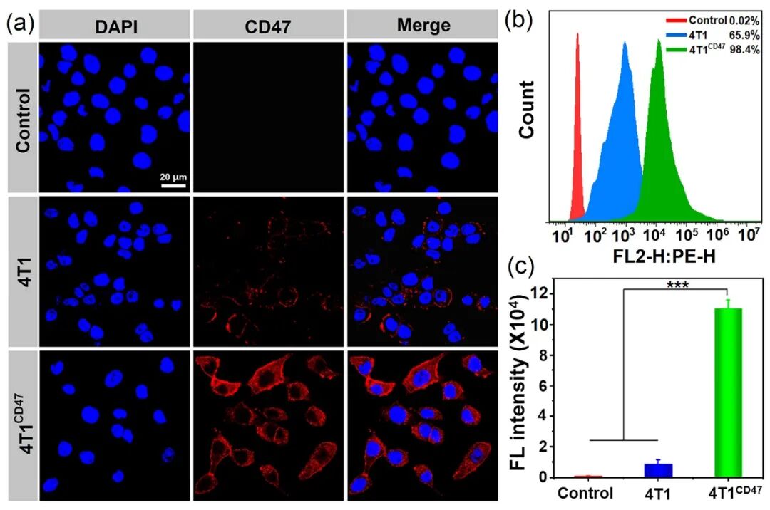 采用基因工程法策略,利用慢病毒包载质粒对4T1肿瘤细胞进行基因转染,获得表面高表达CD47蛋白的4T1肿瘤细胞。如图1所示,激光共聚焦和流式结果都证明基因转染提高了4T1肿瘤细胞表面CD47的表达。
