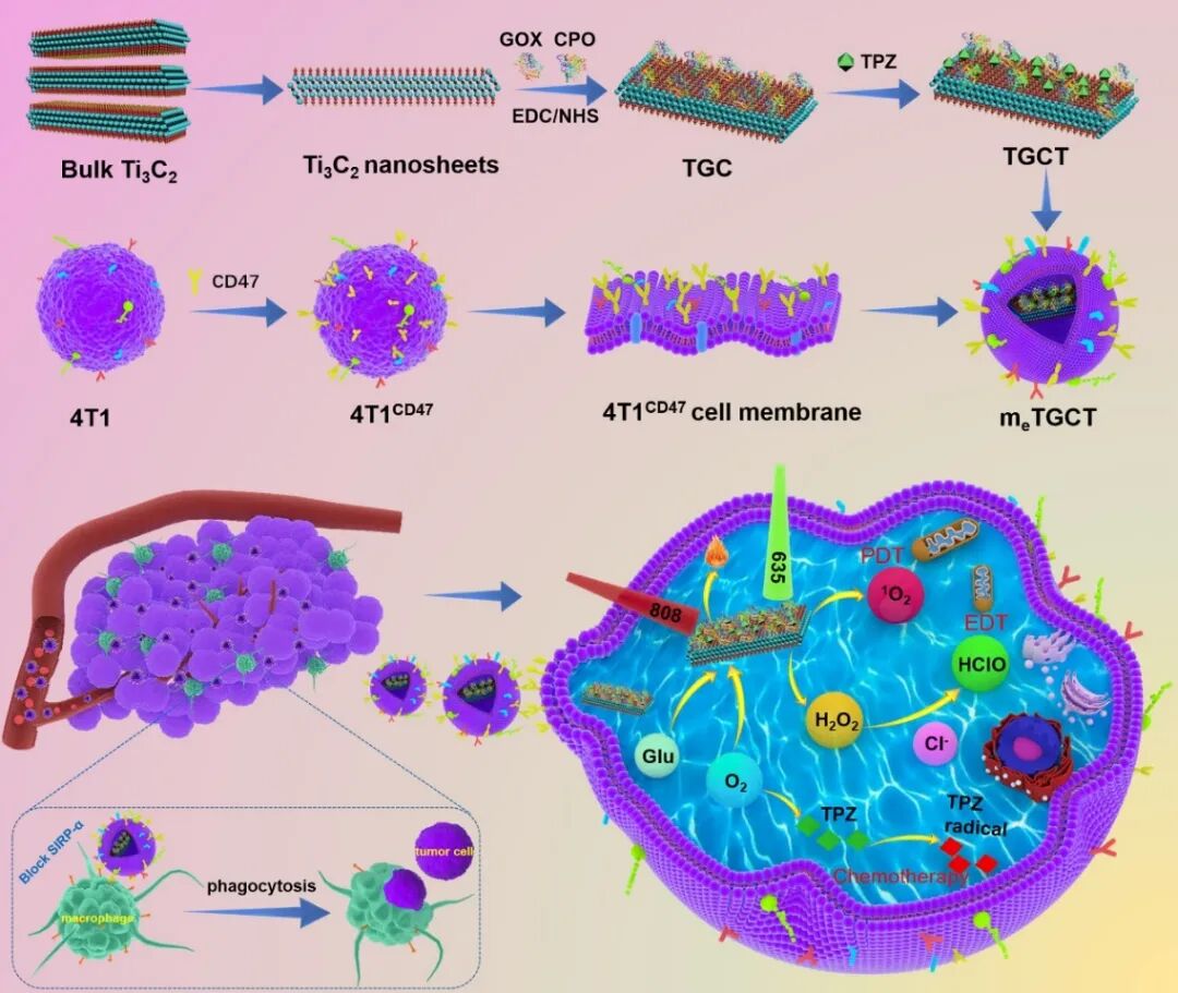 本研究以块状Ti₃C₂为基体,通过液体剥离法制备得到Ti₃C₂纳米片,在其表面通过化学键结合葡萄糖氧化酶和氯化物过氧化物酶,之后负载化疗药物TPZ,并在其表面包裹高表达CD47蛋白的肿瘤细胞膜,获得级联酶纳米反应器mₑTGCT,并对其粒径电位等理化性质进行了表征(图2)。