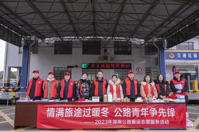 在春节前夕,1月17日,省公路事务中心10余名青年志愿者赴长沙湘江新区齐天庙超限检测站,开展2023年度“情满旅途·暖冬行动”志愿服务活动,努力畅通人民群众返乡路,携手护航公路出行安全。