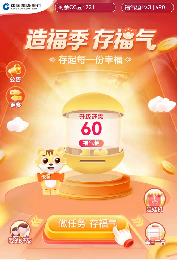 福气值用于升级,级别越高每天领到的cc币越多。
