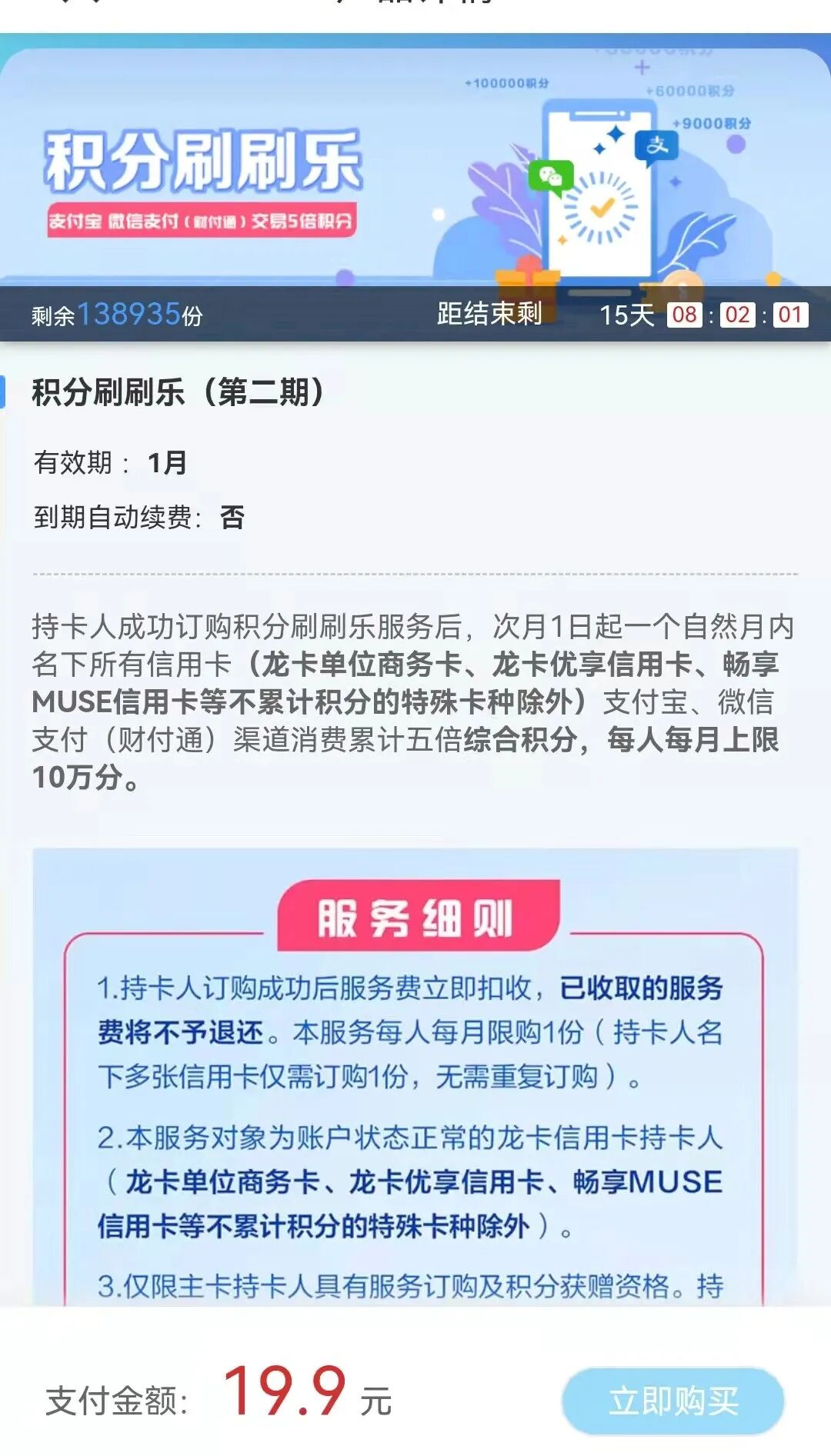 订购后次月1日起,一个自然月内的所有信用卡支付宝、微信支付享5倍综合积分,每人每月上限10万积分。