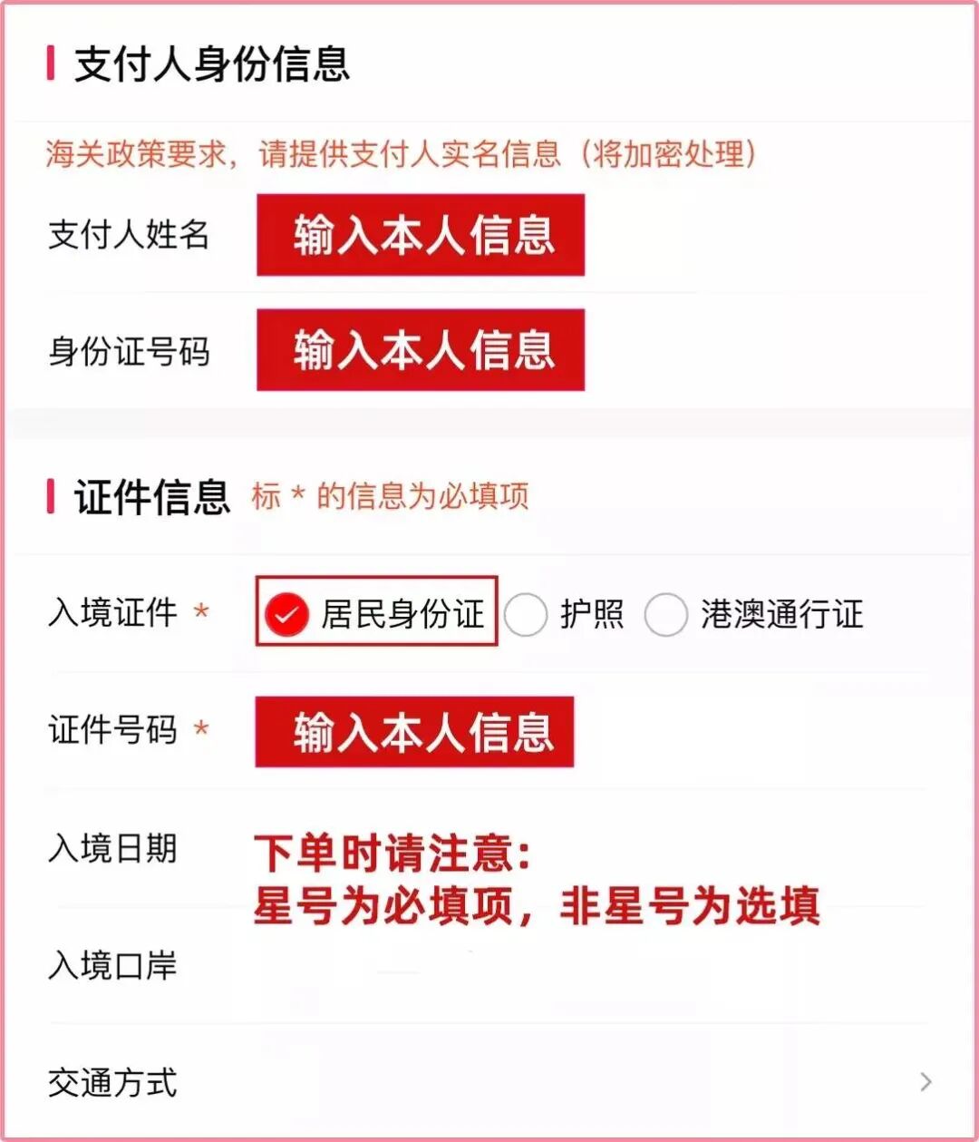 下单时填写支付人信息和带*的必填项,即可成功下单