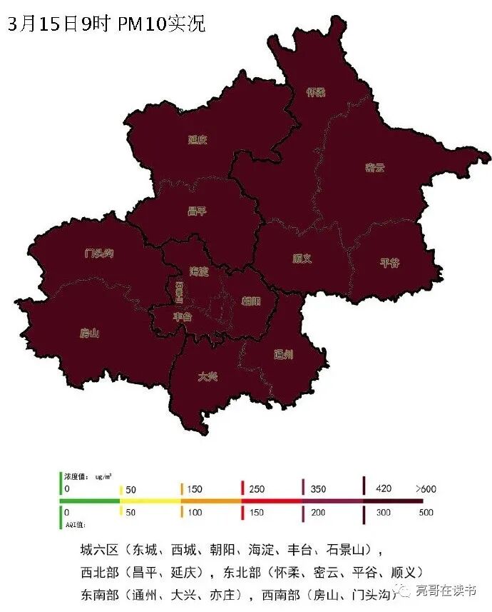 早晨,北京城区的PM10指数是8000以上,其他地区的也在四五千上下。许多地区的能见度不足1千米,甚至只有三五百米。