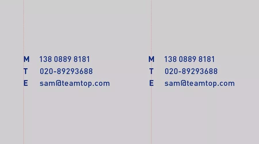 这里为了契合他们企业的气质我用了DIN系列的英文字体。电话、邮箱等统统用了首字母标识,字重方面与详细的信息也有所区分。像 M、T、E 单独三个字母在左对齐的情况下略显怪异,所以更适合如上图右侧做居中对齐。