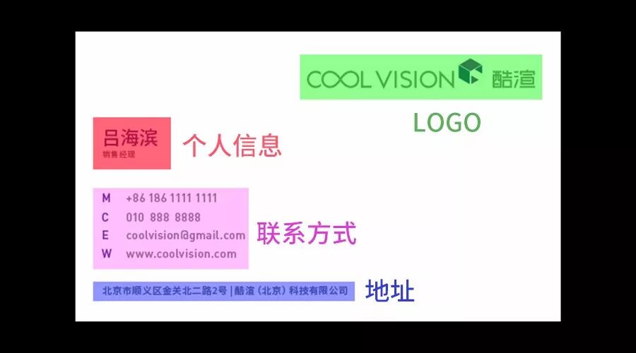 我们可以看到相关信息都被排到一起了,不相关的信息用留白分割,整个名片分为个人信息、联系方式、地址和LOGO四部分。