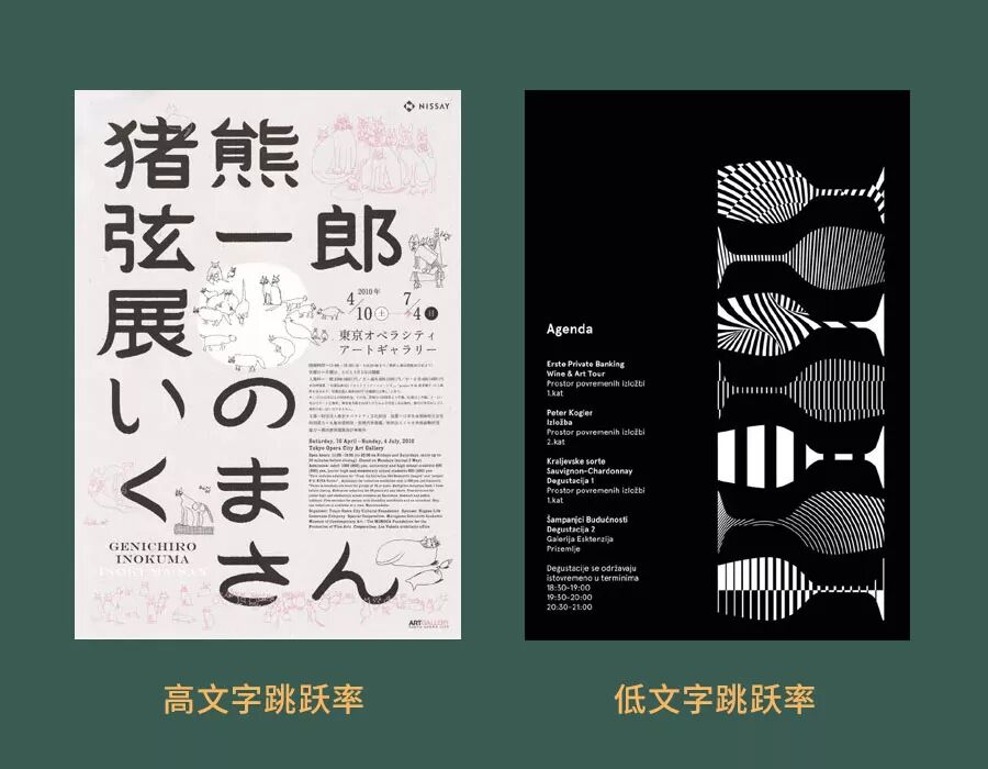 文字跳跃率的高低是对比出来的,像此图的两个案例文字跳跃率都是比较高的,但是放在一起比较左边的更高,而右边的就低了一些。