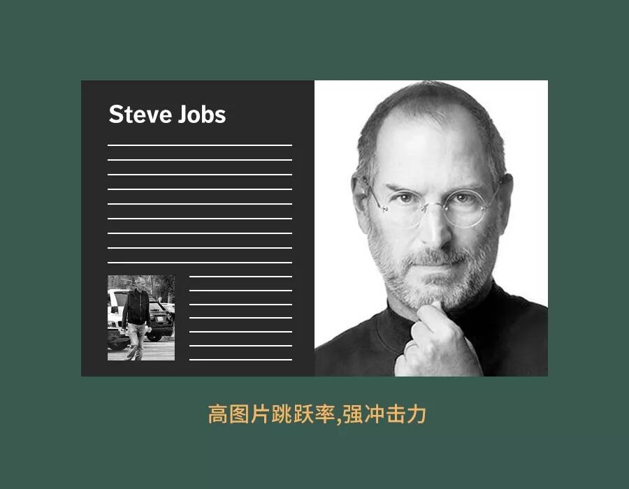 这是两张同样大小的图片,但里面的主体大小不同,图一的乔布斯是特写的方式,头部大小所占的面积就比图二里的全身照还要多。所以图一的比例就大,图片的跳跃率比图二要高。