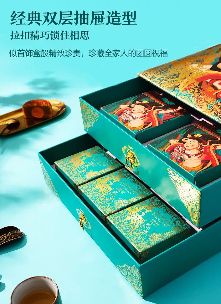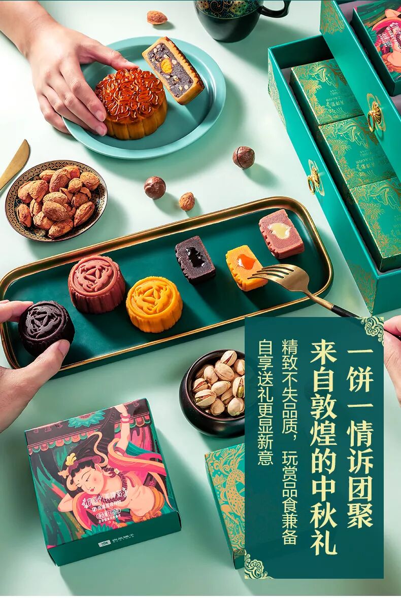 良品铺子的这款月饼包装是包装界的大神——潘虎老师所带领的团队设计的作品。以敦煌文化为灵感设计的《良辰月·舞金樽》《良辰月·弄清影》等中秋月饼礼盒。