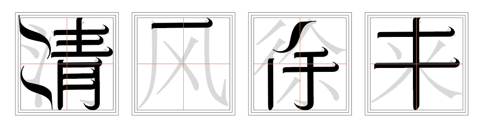 提取笔画就是将西文中的字母或部分特征提取出来,用来拼凑中文字。具体该怎么做呢?可以先将“清风徐来”四个字用正体字打出来,观察这几个字所用到的笔画。