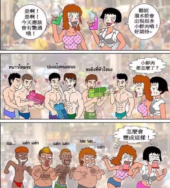 泼水节虽然为泰国重大节日,男女均可参加,可实际上已经成为了Gay圈的狂欢节日,泼水节置身于泰国,赤体肉搏堪称男体盛宴