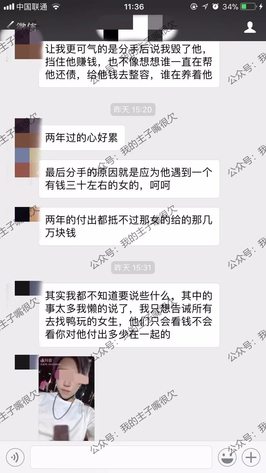 一个妹子2年在一只鸭子身上花了几十万,从此人债台高筑,妹子化身救世主解救他于水深火热,虽然他又虚荣又轻浮还喜欢绿女朋友,出轨和继续不务正业上班都成了他的借口,妹子说“我唯一小小的要求就是他不要背叛我,和不要再为了钱和女人上床了”,结果迎来的背叛是一次又一次,然后开始和妹子开口要车要房,在需求得不到满足的时候,为了几万块就和一个老女人跑了,两年时间,养儿子一样养他,就算是养条狗都养熟了