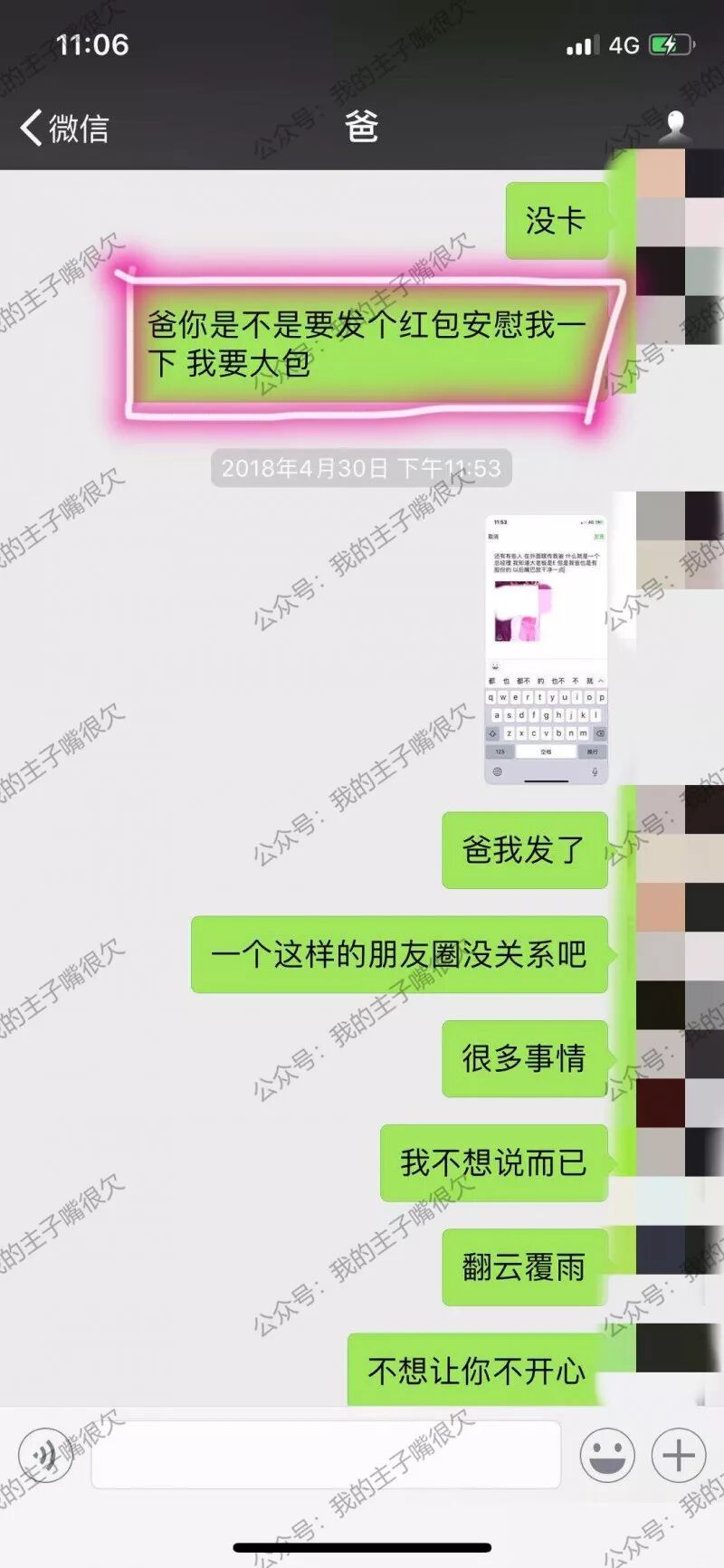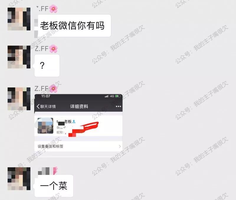 然后主角A当时就被揭穿了,一般人这时候早已无地自容羞愧难当,可是主角A妹子强大的装逼心理素质,她只不过是默默的删除了朋友圈小视屏,继续强大的输出她的“干爸爸”