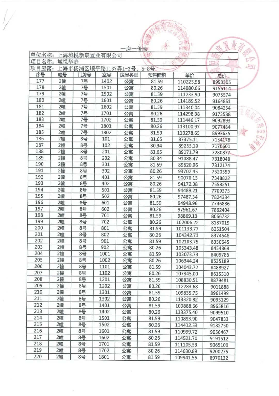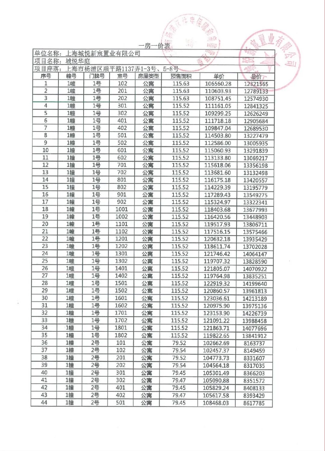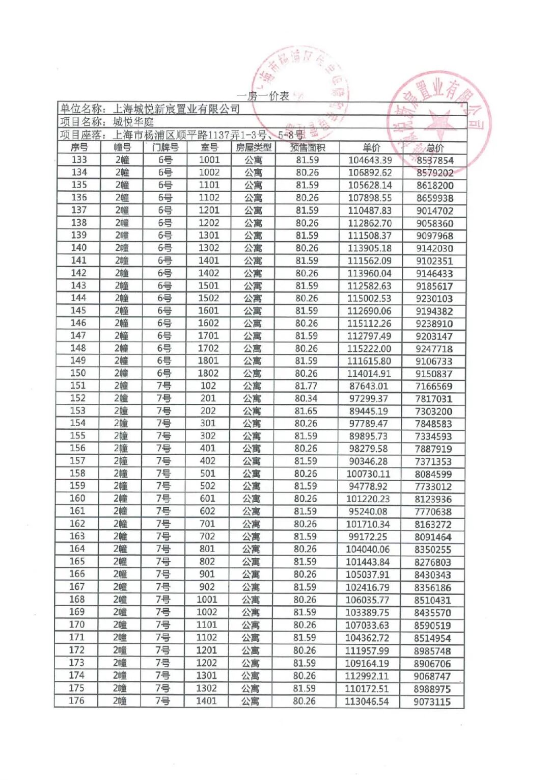 3)最新项目一房一价表公布: