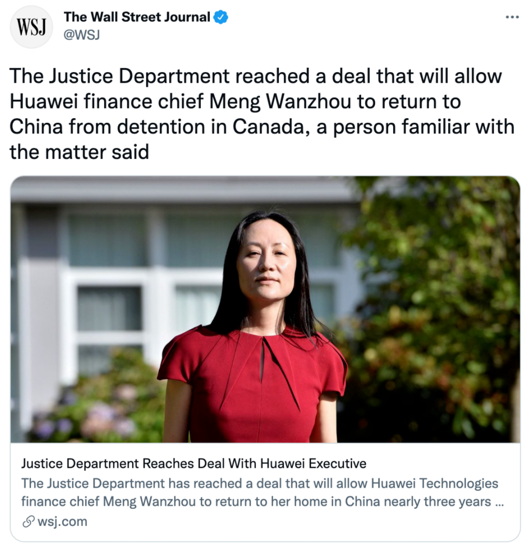 路透社报道称,华为前首席财务官孟晚舟女士已经和美国检察官达成协议,美国将正式撤销对孟晚舟女士的起诉。
