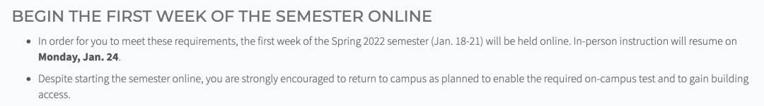 另外,虽然大部分本科生和研究生将在1月18日开始春季学期的课程,但仍然有相当一部分的研究生专业课程在1月初就已经开始了。而他们也将在开学后进行为期两周的线上课程。