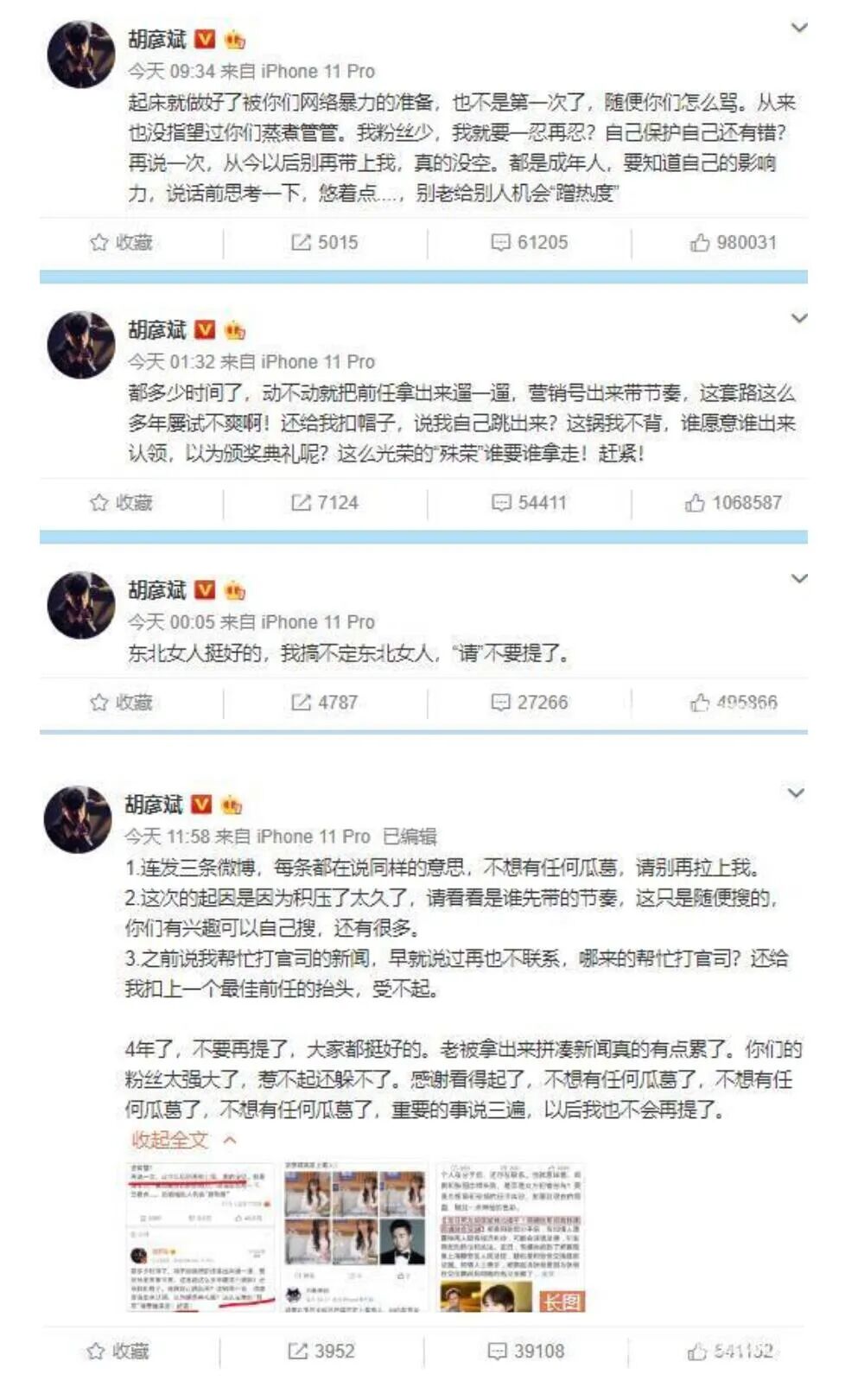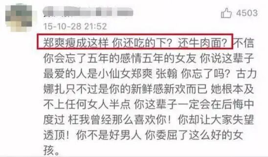 她的前任中胆子最肥的胡彦斌是惟一敢正面刚的,前几天连发四条微博希望不要和郑爽有任何牵连,微博下面一群“路人”损他加戏,“路人”的正义感遇到郑爽才能激发。也难怪她们生气,胡彦斌在郑爽的恋爱故事里是没有姓名的,粉丝只愿意提张翰,可郑爽自己要提,不但写进书里,还连写一百条。