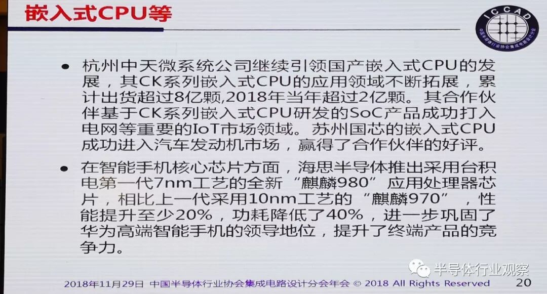 杭州中天微系统公司继续引领国产嵌入式CPU的发展,其CK系列嵌入式CPU的应用领域不断拓展,累计出货超过8亿颗,2018年当年超过2亿颗。