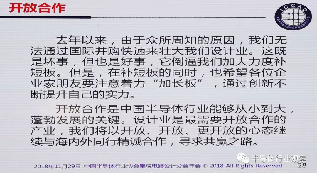 开放合作是中国半导体行业能够从小到大蓬勃发展的关键。设计业是最需要开放合作的产业,我们将以开放、开放、更开放的心态继续与海内外同行精诚合作,寻求共赢之路。