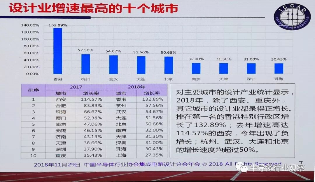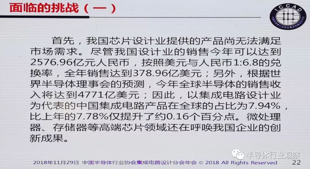 2018年全行业销售预计为2576.96亿元,比2017年的1945.98亿元增长32.42%,增速比上年的28.15%提高了4.27个百分点。按照美元与人民币1:6.8的兑换率,全年销售达到378.96亿美元,在全球集成电路设计业的占比将再次提高。