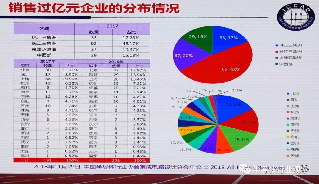 在通信、智能卡、计算机、多媒体、导航、模拟、功率和消费电子等所有8个领域,企业的数量都在增加。从事通信芯片设计的企业从2017年的266家增加到307家,对应的销售总和提升了16.34%,达到1046.75亿元;智能卡企业从上年的62家增加到71家,但销售总和下降了0.72%,为138.14亿元;从事计算机芯片设计的企业数量从去年的85家增加到109家,销售大幅提升180.18%,达到359.41亿元。