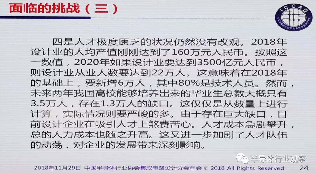 二是我国集成电路设计业的主流设计技术并没有太明显的进步。总体技术路线尚未摆脱跟随,跟在别人后面亦步亦趋的现状没有根本改变,产品创新能力还需提高。我国企业依靠工艺和EDA工具进步实现产品升级换代的现象尚无改观。能够自己根据工艺,自行定义设计流程、并采用COT设计方法进行产品开发的企业仍然是凤毛麟角。