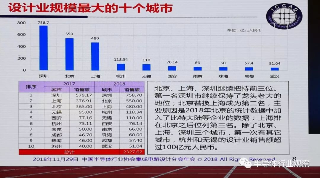 北京、上海、深圳继续把持前三位。第一名深圳市继续保持龙头老大的地位;北京替换上海成为第二名,主要原因是2018年北京的统计数据中加入了比特大陆等企业的数据;上海排名在北京之后位列第三名。除了北京、上海、深圳三个城市,第一次有其他城市,杭州和无锡的设计业销售额超过100亿元人民币。