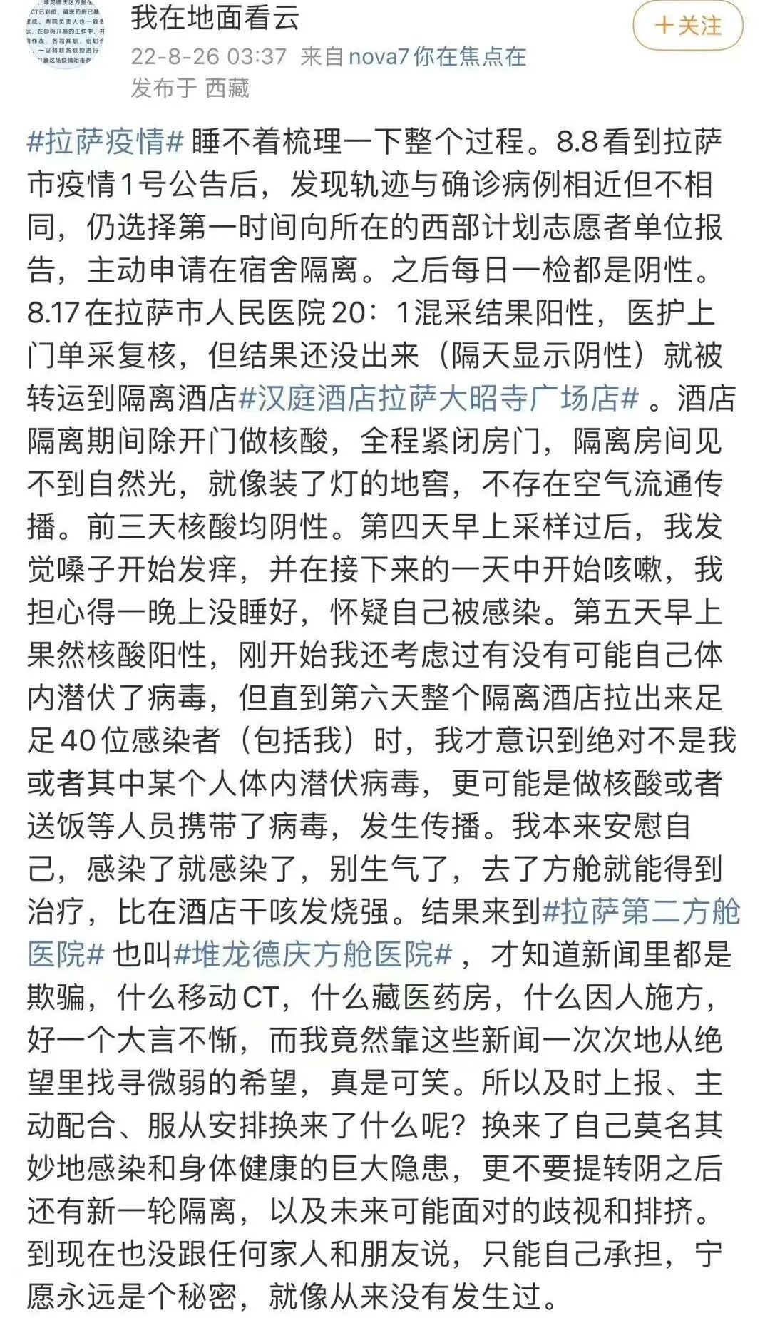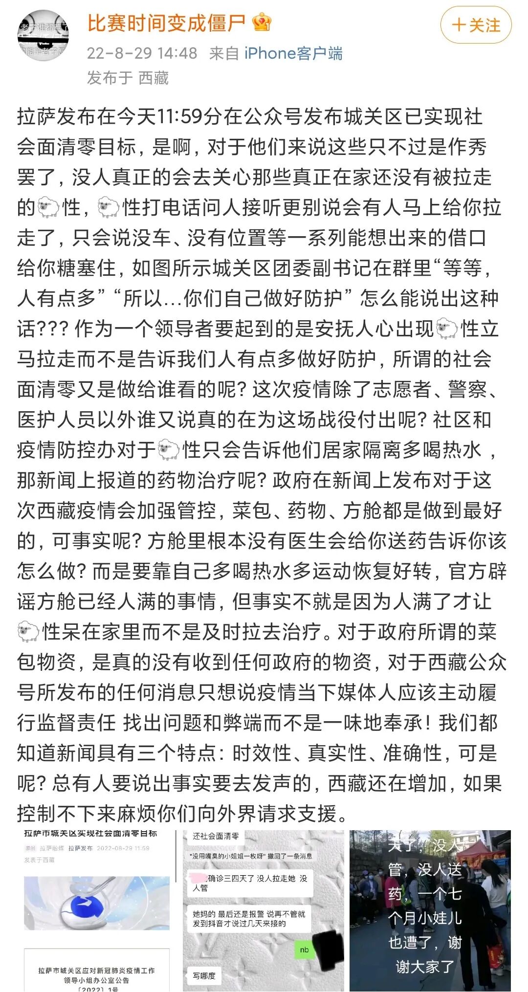 “现在社区干部还在无动于衷,我有抱负,我有想给拉萨贡献我自己胆量,但是我想错了,之前我也想过大家都不容易,没有必要去发声,但是我莫名的感觉情况不是我想的那样,越来越严重,拉萨你还能好起来吗?我们还要等多长时间才能回归正常生活?”