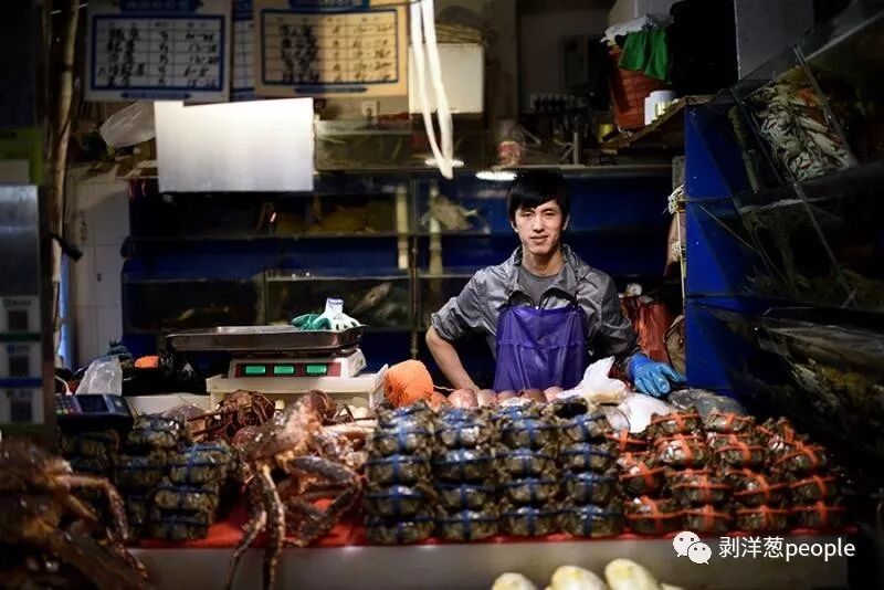 他从超大号的厚袋子里掏出六只帝王蟹,摞了一米多高,摊子一下子热闹起来。两个女孩子拿起相机,在帝王蟹旁边摆拍合影。