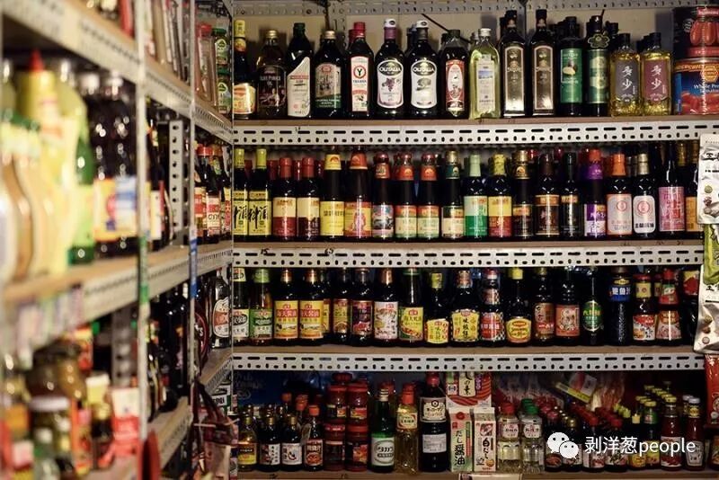 三源里菜市场,整个货架上摆满了各国的调味品。