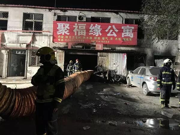 聚福缘公寓是个局部三层的老旧公寓。据官方通报,经初步调查勘验,聚福缘公寓东西长80米,南北宽76米,占地面积6080平方米,建筑面积约20000平方米,地下一层,地上两层,局部三层。地下一层为冷库区,共有6个冷库间,总面积5000平方米,目前正处于设备安装调试阶段。地上一层为餐饮、商店、洗浴、广告制作、生产加工储存服装等商户,总面积约6600平方米;地上二层、局部三层均为出租房,总面积约8300平方米,共305间房、租住400余人。该建筑是典型的集生产经营、仓储、住人等于一体的“三合一”、“多合一”建筑。