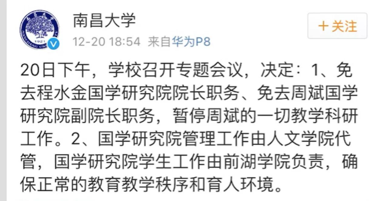 今日18点54分,南昌大学官微发布,免去周斌国学研究院副院长职务。