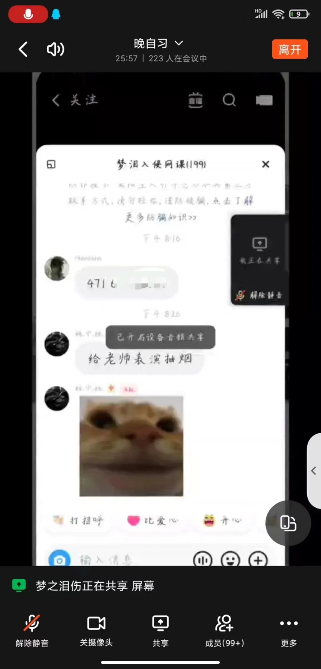 在“梦之泪伤”控制共享屏幕之后,所有人都能看到“梦之泪伤”视角的屏幕,他偶尔切换到其他聊天界面,张斯威眼疾手快地截图了一张疑似爆破猎手组织的群聊。图片显示,那是一个名叫“梦泪入侵网课”的聊天群,群成员一共有199人,其中有人在群里发了一串数字,疑似一串会议号,另一人在群里说“给老师表演抽烟。”