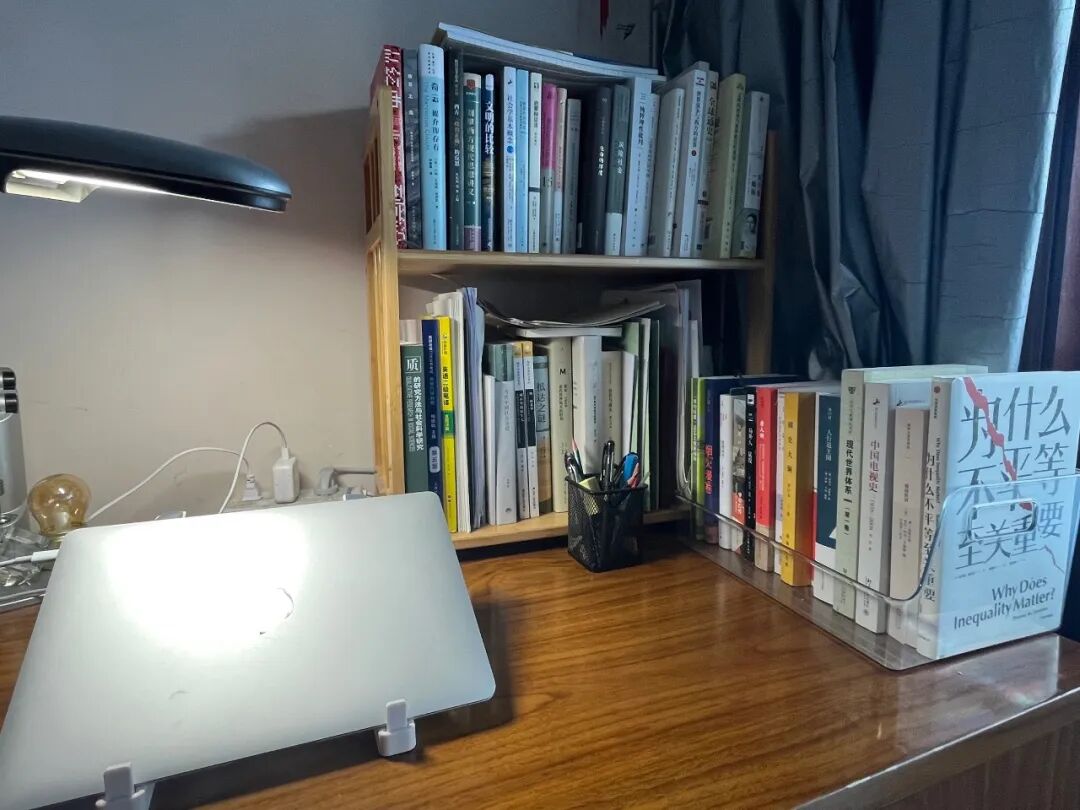 与需要看大量文献,与数据打交道的章宁不同,人文研究需要看书,从书中才能学习完整、系统的观点。不足10平米的二人间博士宿舍内,属于周启的区域到处都是书。三层书架上,“站立”的书未填满的空间被平放的书塞满。桌面上的书和读书笔记围成半包围的形状,占据桌面一大半空间。书桌旁凳子的一侧,两排书高高摞起。“为了避免圈定议题偏狭,但凡与研究相关的,我都会读一读,尽可能追求比较全面。”周启说。除了躺在床上的时间,几乎所有清醒的时刻,周启蜷缩在书与书的“围城”中,阅读,写作,思考。