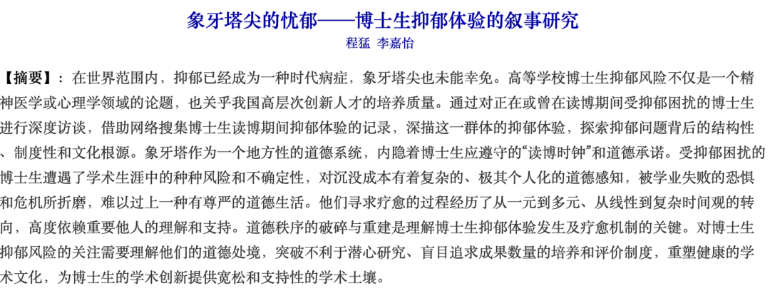 北京师范大学教育学部讲师程猛在读博期间也曾有过抑郁体验。关注到博士生群体广泛面对的抑郁问题后,程猛把目光聚焦于身处象牙塔尖、受抑郁困扰的博士生群体,完成了《象牙塔尖的忧郁——博士生抑郁体验的叙事研究》。