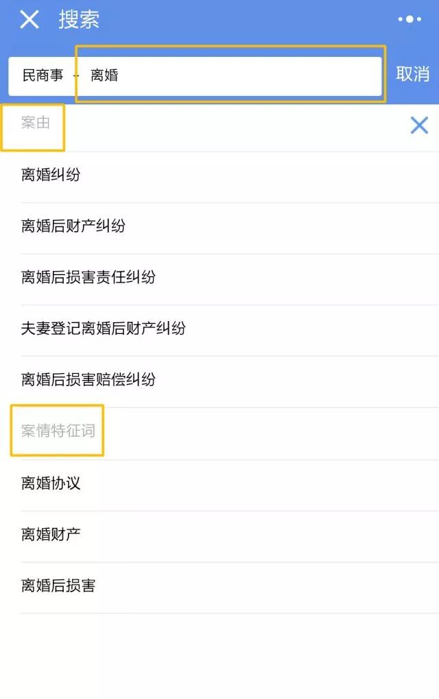 选择好分库类型后,在搜索框里输入想要检索的案例关键词,智库就会自动显示出相关的要素与引导项,点击相关引导项就可以完成具体关键词的输入。关键词输入完成后,点击“搜索”按钮,就可以进行案例检索了。