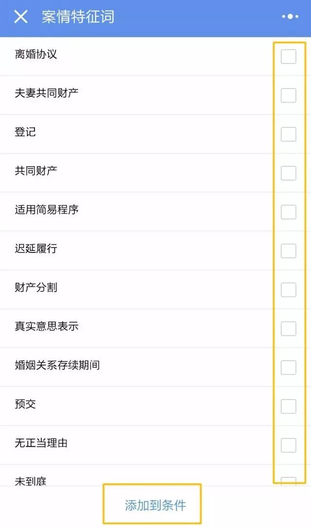 点击页面右边的小方框可以勾选具体条件,选择完毕后点击“添加到条件”按钮,所有类型的条件都筛选完毕后,点击“搜索”按钮就可以完成更具体的案例搜索啦!