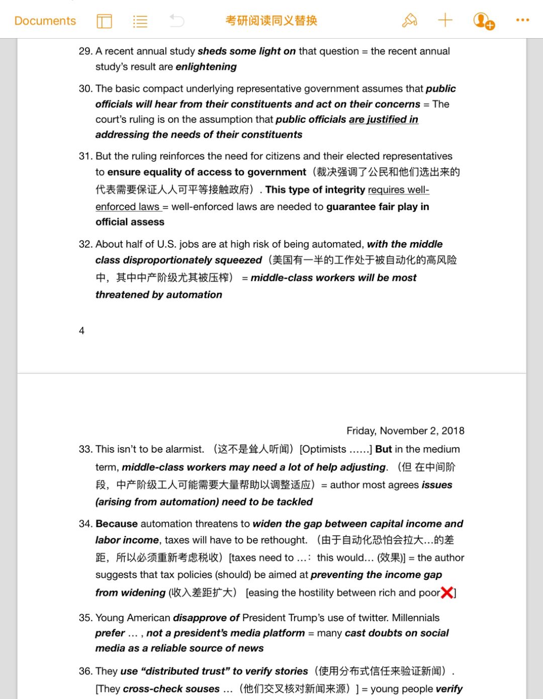 3.分析每道题目+整理同义替换。一定要分析每道题目,弄清楚为什么选这个选项,不选另外三个选项。出题老师出题是有套路的,你一定要把真题研究透了。题目分析何凯文的那本阅读书里也有讲到,你可以辅助性地参考下,重点是你自己要多总结多领悟。分析完题目之后要整理同义替换。什么是同义替换呢?实际上,在你研究完几年的真题之后你就会发现,考研英语阅读中每道题目的答案都是可以在原文中找到对应的句子的,这就是同义替换。当你整理多了,你就知道出题老师的出题套路了。下面是我整理的一些同义替换,师弟师妹要自己整理作用才是最大的。