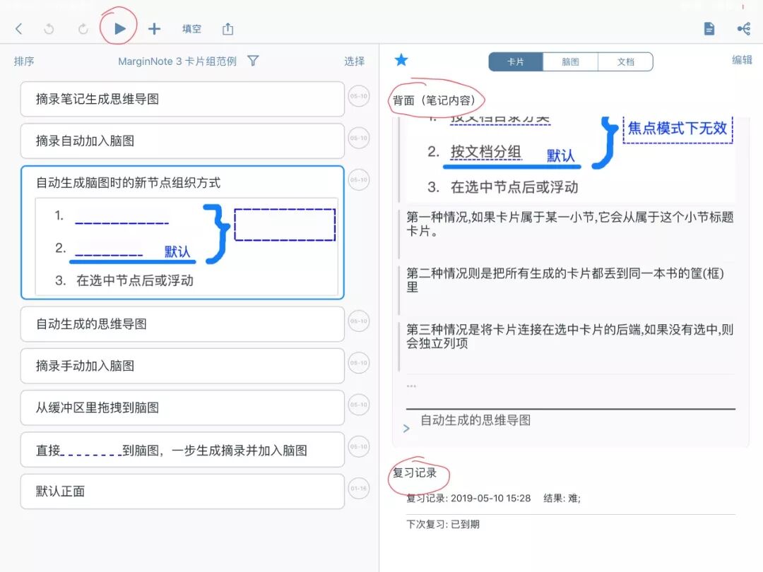 卡片组由你导入复习模块的记忆卡片组成,卡片组的界面比较简单:上方是工具栏,左侧是记忆卡片的列表,右侧是选中的记忆卡片详情。点击工具栏中的播放键就可以进入回忆模式,根据记忆的情况,在翻面后选择难度,系统就会把这一次的复习情况记录下来,复习记录可见于右侧的卡片详情最下方。