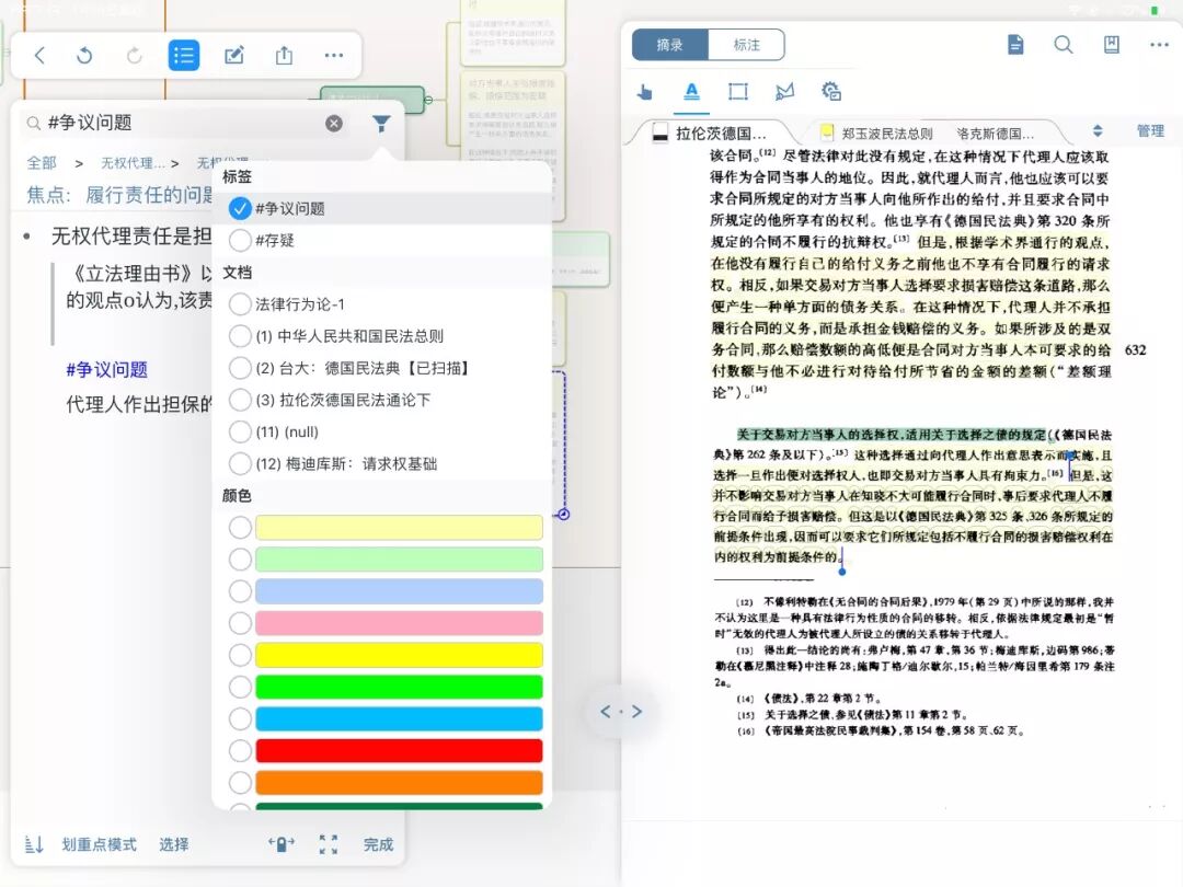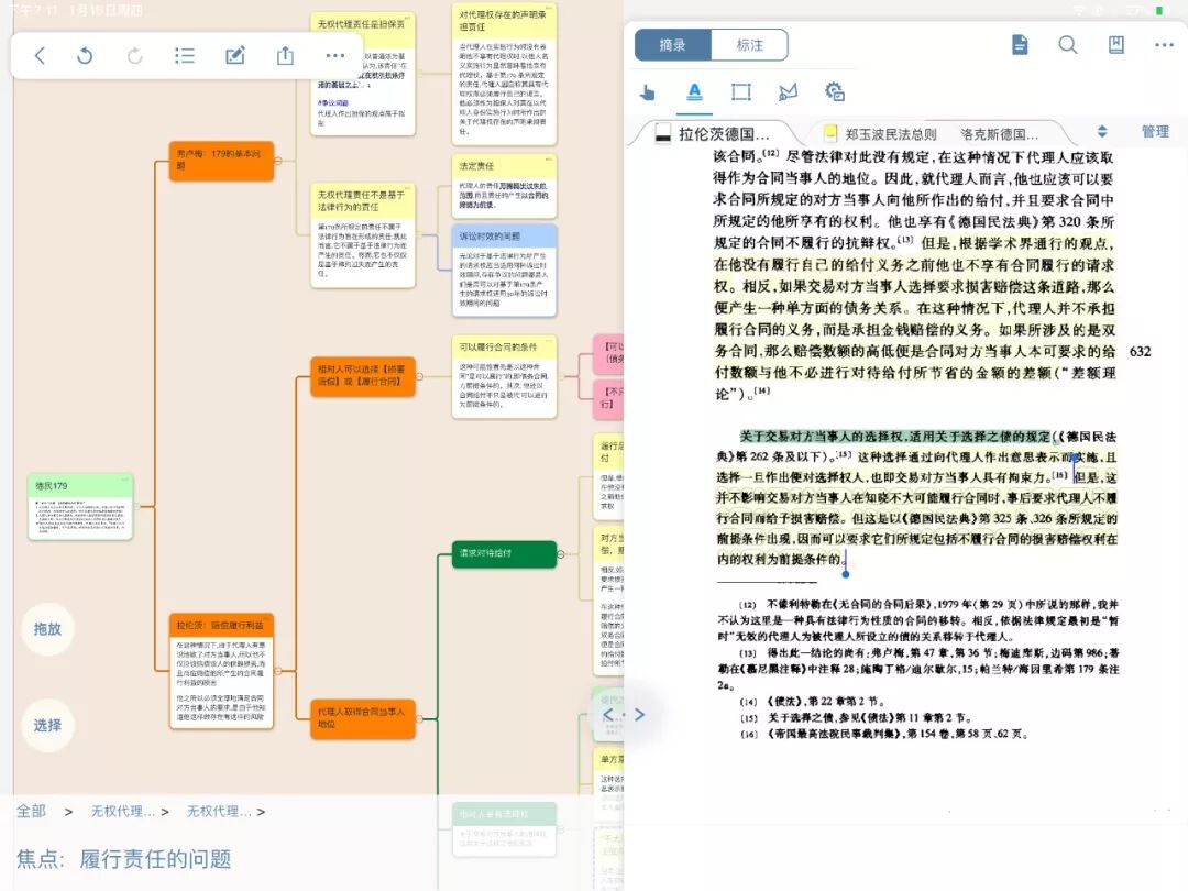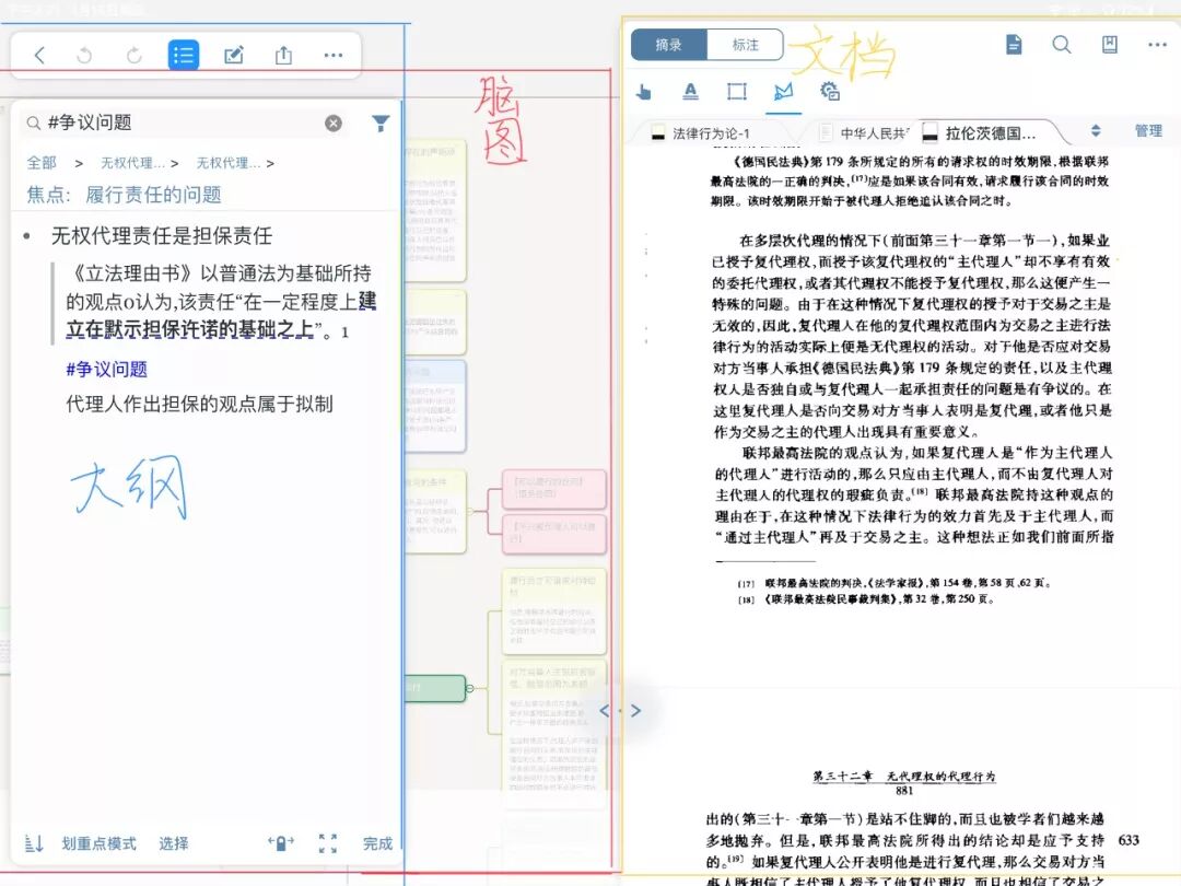 Mn3的开发者可能或多或少受到了这种读书方法的启发,才开发了这款“不需要伤害书籍”的大卸八块读书法。用这种方法,我尝试阅读“无权代理责任”这一部分的内容,并且这次超出了《民法总则》这一本,将国内外各种教科书、文献中的内容都整理了进来,详见下图。