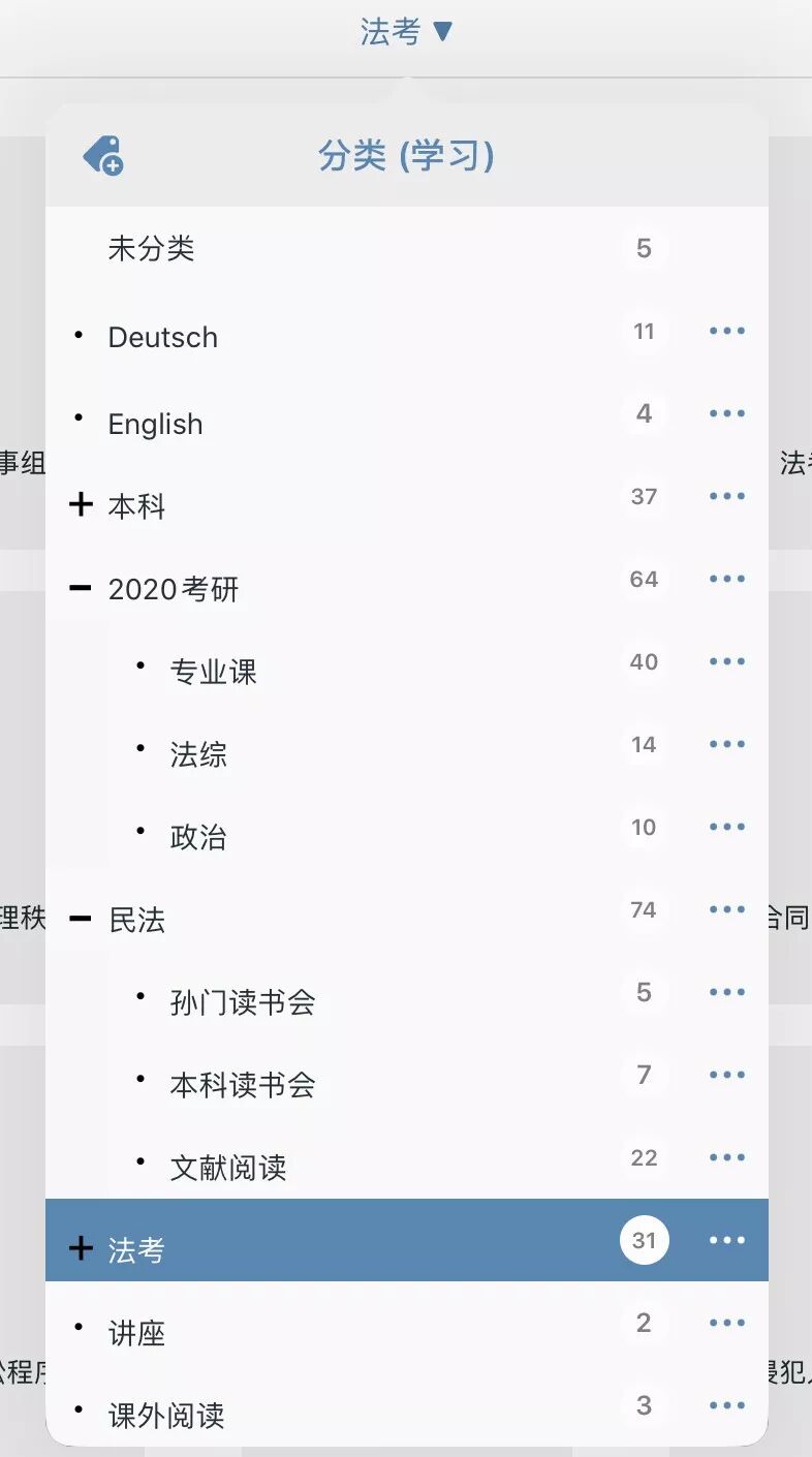 标签功能可以帮助读者更加快速的定位到不同类型的卡片上,读者也可以用颜色来进行更直观的分类。例如作者会给“需要课后自学的内容”或“现有文献不能解决的问题”标记为“自学内容”和“存疑”,等到有时间的时候统一解决;也会把自己对材料的归纳总结专门标记出来,从而对这类主观性内容保持自我批评的警惕。此外,作者会将框架性卡片标为橙色、提问性卡片标为蓝色,纯内容标记为黄色,结论标记为粉色,需要背诵的卡片标记为蓝色或墨绿色,法条为浅绿色,案例为紫色。这种可视化的分类在回忆的过程中常常能够帮助我事半功倍。