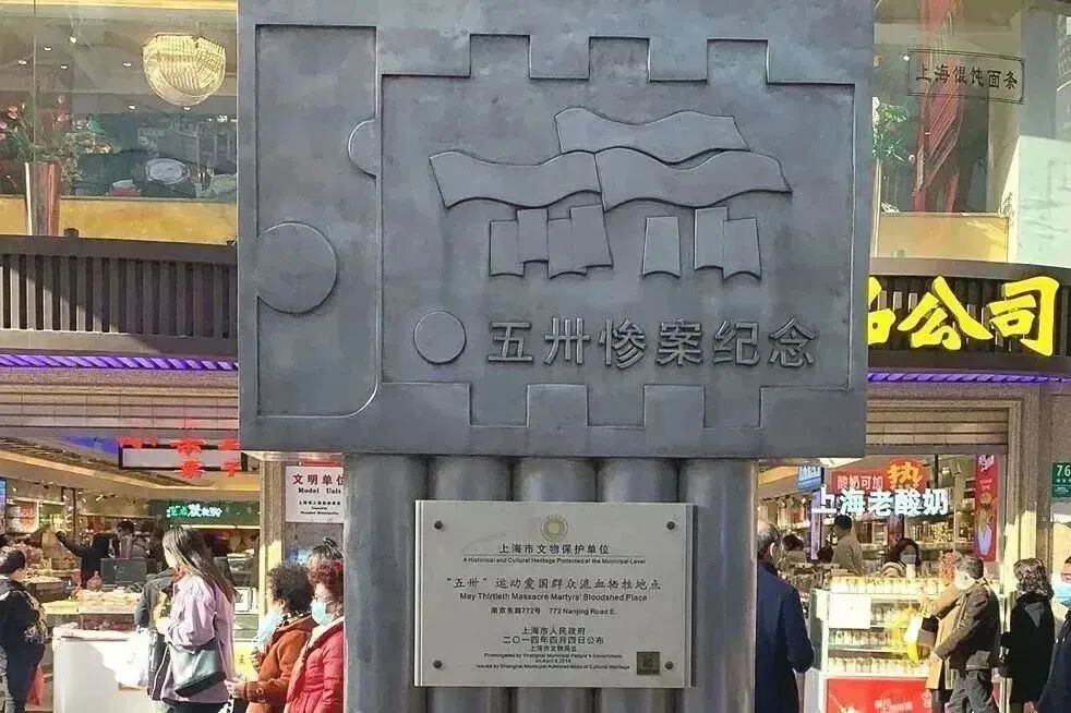 在南京路步行街西段街心处,著名的泰康食品公司门前,低调地耸立着一座不锈钢纪念碑。它在如织的人流中似乎并不起眼,但上书的“五卅惨案纪念”几个大字,却无言地讲述着九十多年前那场著名反帝爱国运动所展现出的名族气节和铮铮铁骨。