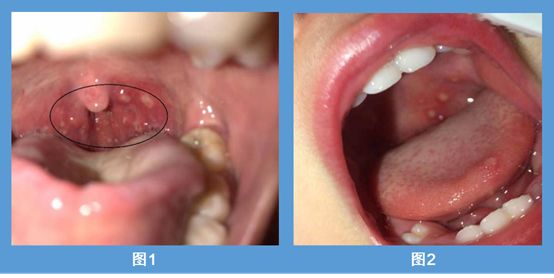 如下图所示,口腔皮疹在口腔分布位置相对靠后,集中在腭舌弓、软腭、扁桃体位置的为疱疹性咽峡炎,见图1;而口腔皮疹分布于颊粘膜和上颚,同时在手足部容易发现皮疹的为手足口病,如图2所示。