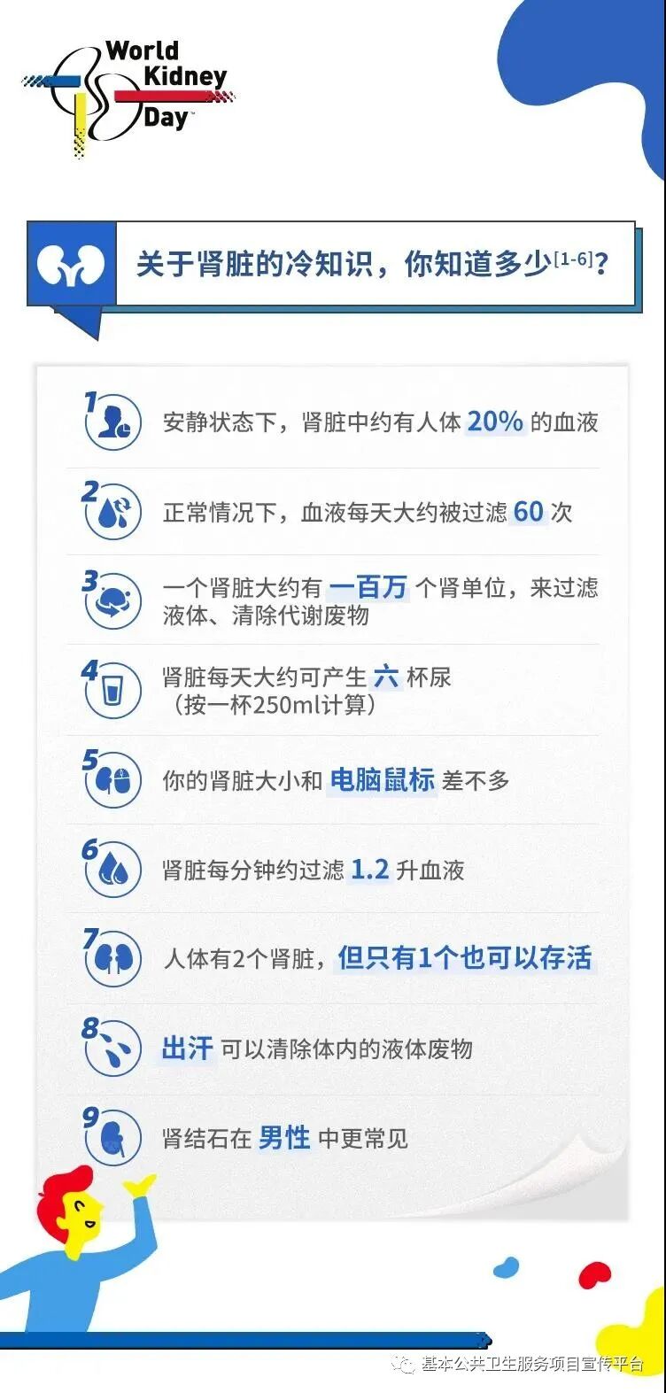 目前,全世界有 8.5 亿人患有肾脏疾病,在我国,慢性肾脏病患病率已高达 10.8%,即十个人中有一个肾脏病人!全球因慢性肾脏病接受透析的患者人数正以每年 5%~8%的速度持续增长,预计到 2040 年,慢性肾脏病将成为危害全球人类健康的第五大杀手。为了提高人们对慢性肾脏疾病及早期检测和预防对延缓慢性肾脏病的重要认识,从 2006 年起将每年 3 月份的第二个星期四为世界肾脏日。世界肾脏日是由国际肾脏病学会(ISN)和国际肾脏基金联盟(IFKF)联合提议设立,旨在提高全世界人们对肾脏疾病的认识,从而减少肾脏疾病的发生率及肾脏相关疾病对健康造成的影响。