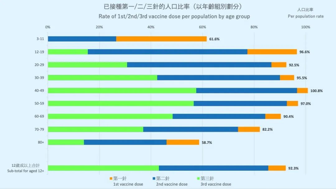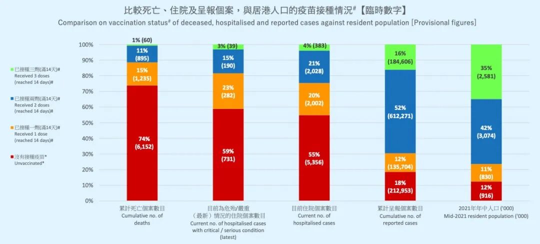 与香港整体人口比较,接种了三针疫苗的人感染比例显著降低,在危重症和死亡病例中的占比更是极低,这可能反映了接种三针疫苗能有效预防感染、重症及死亡。